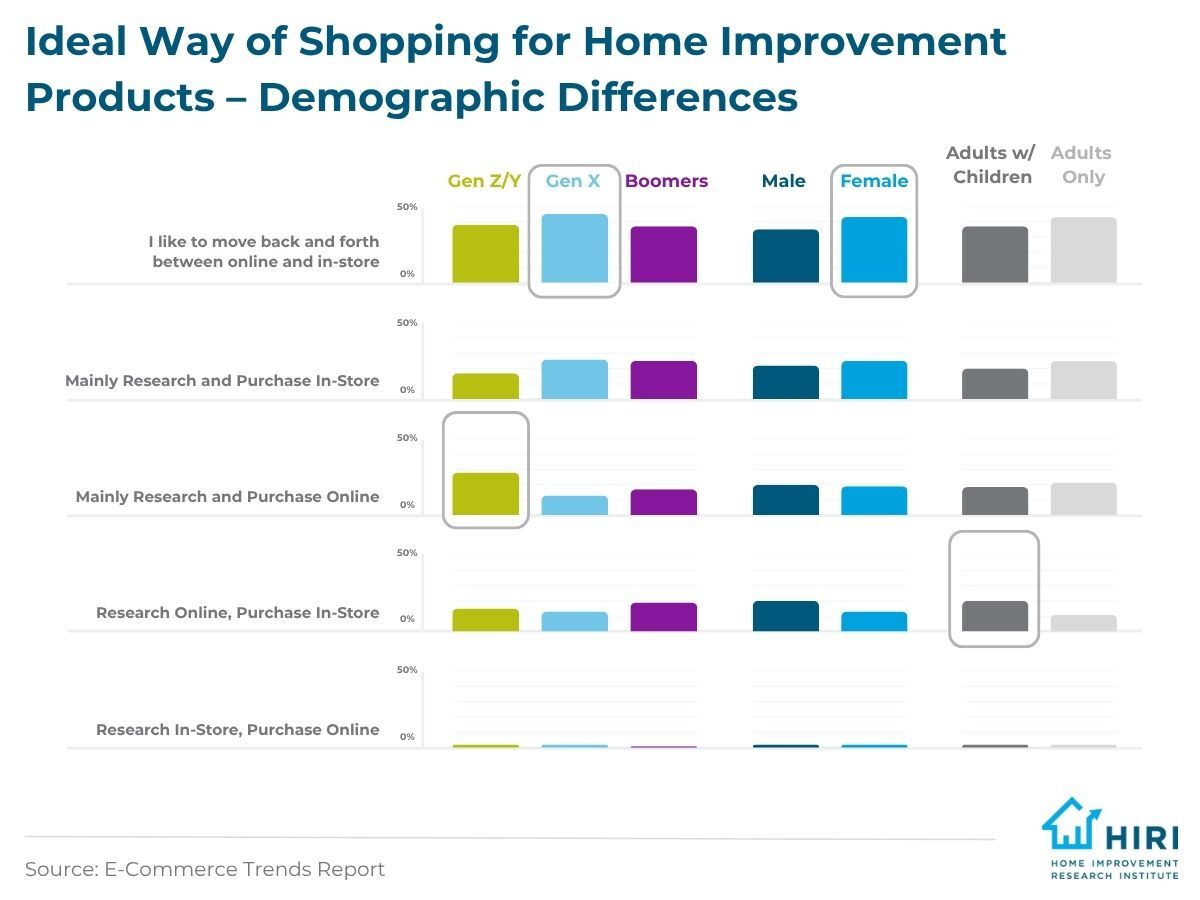 It probably comes as no surprise that younger generations, such as Millennials and Gen Z, lead in online behaviors, while older generations maintain the desire for shopping in stores. However, our study uncovers other nuances among the different demographics and their preferred way of shopping for home improvement products. For instance, adults with children are twice as likely as adults-only households to prefer researching products online and then purchasing them in store. Household makeup, gender, and generation affiliation are all factors that can influence preferences and behaviors.