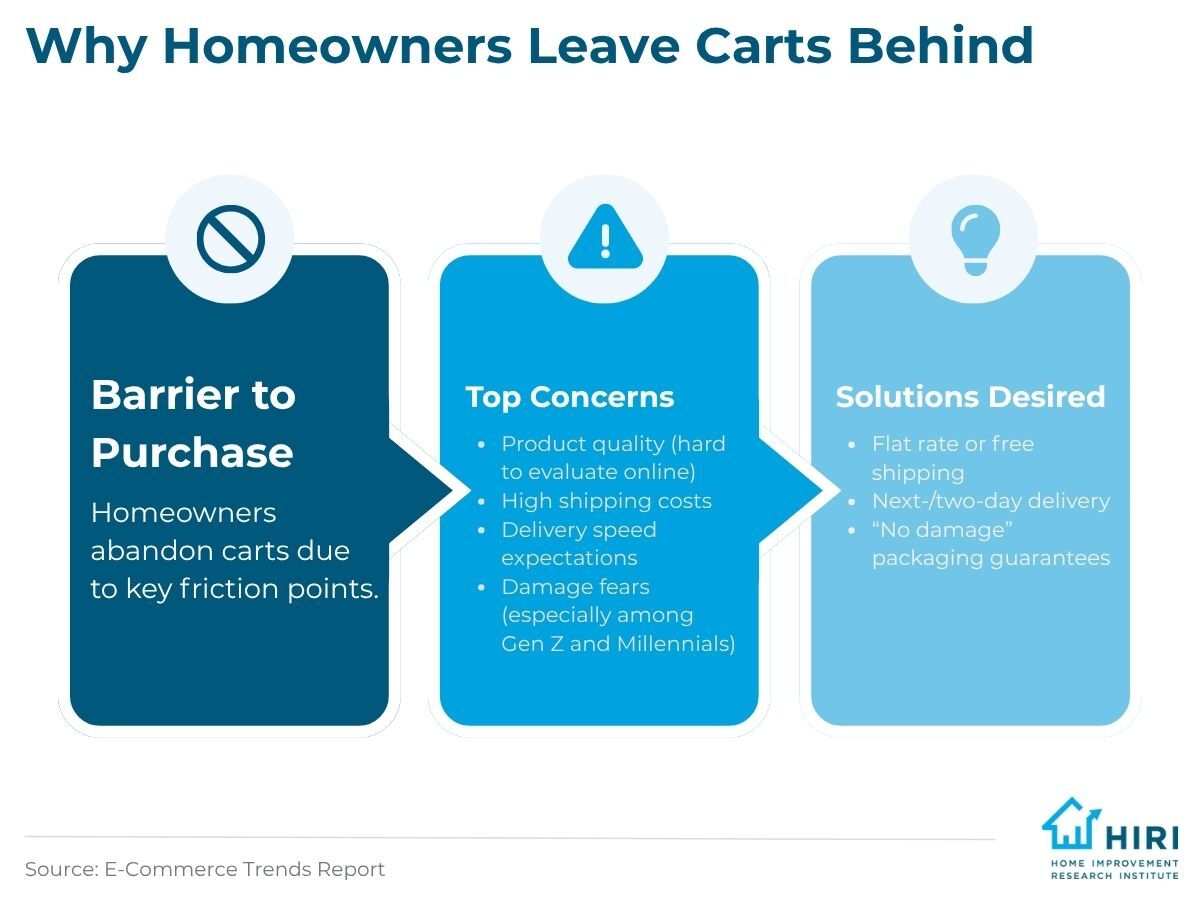 For marketing managers, one challenge can be to increase actual online conversions. Certainly, homeowners may be willing to look around e-commerce sites and even add items to their cart, but something stops them before they complete the purchase. Our research shows that some of the main barriers that undermine conversion include difficulty evaluating product quality, high shipping costs, and the need for same-day delivery or pickup. More than a third of homeowners abandon their online shopping carts because of these issues. Additionally, Gen Z and Millennials show a higher concern about their products arriving damaged. The study digs into some desired solutions, or improvements that might encourage more online purchases, such as guaranteed next-day or two-day delivery, flat rate or free shipping, and certified 'no damage' packaging guarantees.